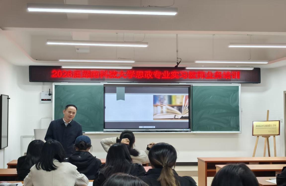 11月6日晚,“2026届湖科大思政专业实习教师业务培训”系列活动在浏阳新翰高中图书馆三楼举行。本次活动特邀湖南科技大学86届校友、浏阳新翰高中常务副校长、特级教师潘明主讲,主题为“做幸福的教育,做幸福的教师”,围绕教育的本质、教师的价值追求以及教育时间的意义等议题展开深入探讨,旨在引导实习教师树立正确的教育观念,提升职业认同感与幸福感。本次讲座由浏阳新翰高中督导评价中心、人力资源部主任赖诚主持,湖南科技大学马克思主义学院2022级思想政治教育专业浏阳实习队全体成员聆听了讲座。