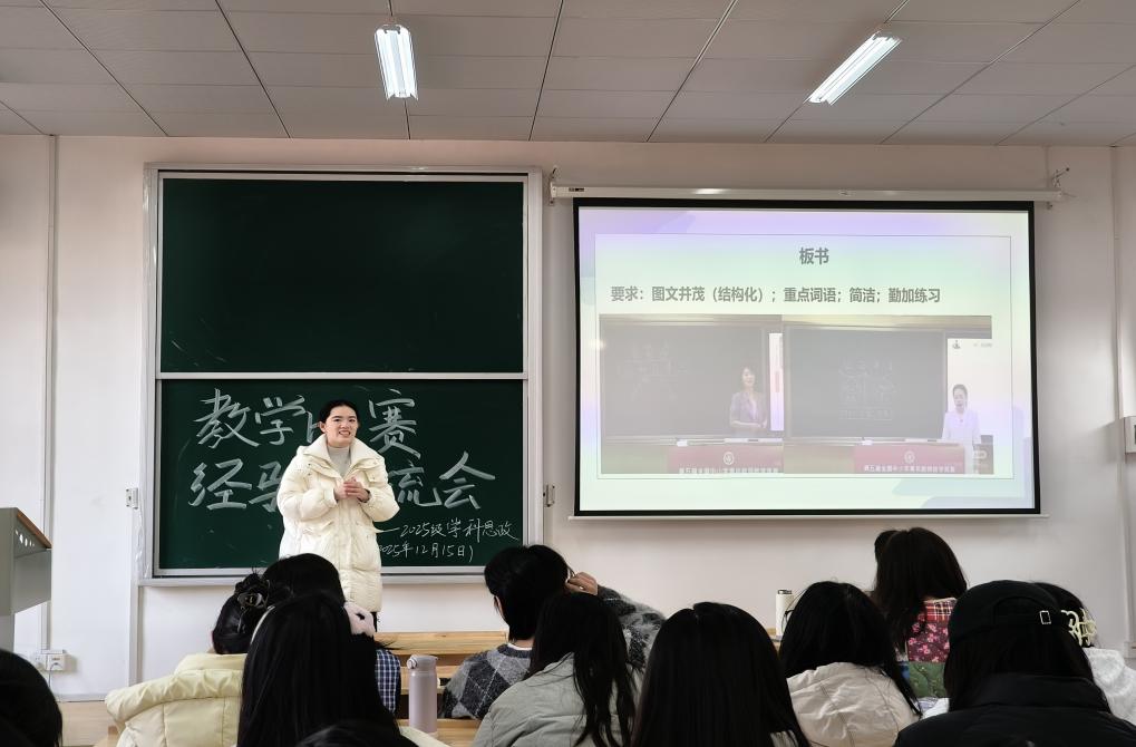 在经验分享环节,2023级研究生向桢芹、王迁应邀分享了各自的参赛经验与心得。向桢芹结合其荣获“田家炳杯”教学技能竞赛等多项奖项的丰富经历,系统解构了竞赛中的“十分钟授课”艺术,并现场以《长安的荔枝》为课堂导入举例,进行了生动的教学片段示范。王迁则讲述了自己从观摩者到参赛者的心态蜕变与行动历程,强调了扎实准备与主动抓住机遇的重要性。