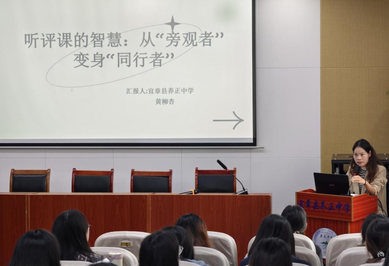 紧接着,宜章县骨干教师、养正中学高一政治备课组组长黄柳杏老师以《听评课的智慧:如何从“旁观者”变身“同行者”》为题展开分享。她直指传统听评课的“身份割裂”痛点——听课者常沦为“课堂观众”“局外人”,评课时多讲“场面话”,课后与授课者缺乏专业交集,难以形成成长合力。她明确“同行者”的核心定位:听评课人员需与授课者目标一致、双向互动,以“观察-反思-借鉴”的闭环,让教研真正成为教师成长的“合力场”。在听课环节,她提出需聚焦教学目标与内容、教学环节与方法、师生互动与学情、教师素养与细节四大核心维度;同时给出实操路径,课前要提前了解课题课标、沟通重难点设计,课中需区分客观记录与主观思考、聚焦可迁移实战细节,课后10分钟内及时补记遗漏信息并标注请教问题。评课环节,她强调核心是“互助成长”而非“挑错”,需遵循“肯定亮点+聚焦问题+给出建议”原则,围绕教学目标达成、环节方法设计、师生互动实效、教学基本功、思政特色呈现等维度展开。针对新手教师,她推荐“亮点+困惑+请教”的评课模式,助力快速融入教研;被评课时则要保持“空杯心态”,重点记录具体改进建议并落地实践。黄柳杏老师特别指出,听评课的最终落点是“转化应用”:新教师需整理“听课反思表”,梳理可借鉴方法、需规避问题及个人改进方向;再通过“模仿+创新”将所学技巧融入备课,结合学情调整细节,以“实践-反思-再实践”的闭环加速专业成长。在交流环节,实习生们围绕听评课的具体操作积极提问,黄柳杏老师结合实例一一回应,引发了深入讨论。
