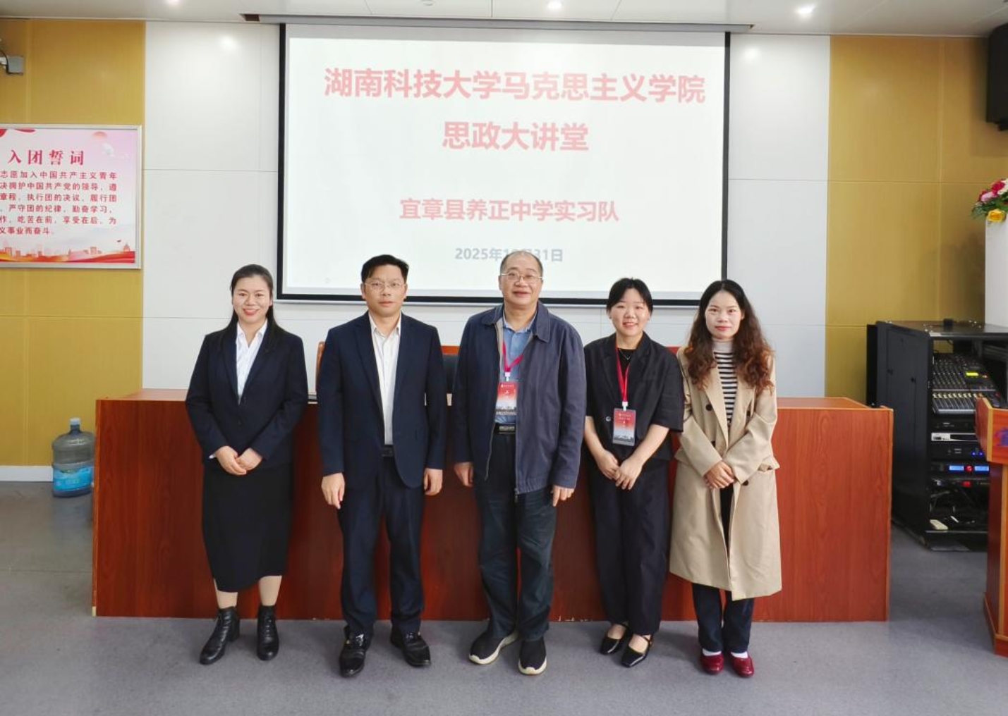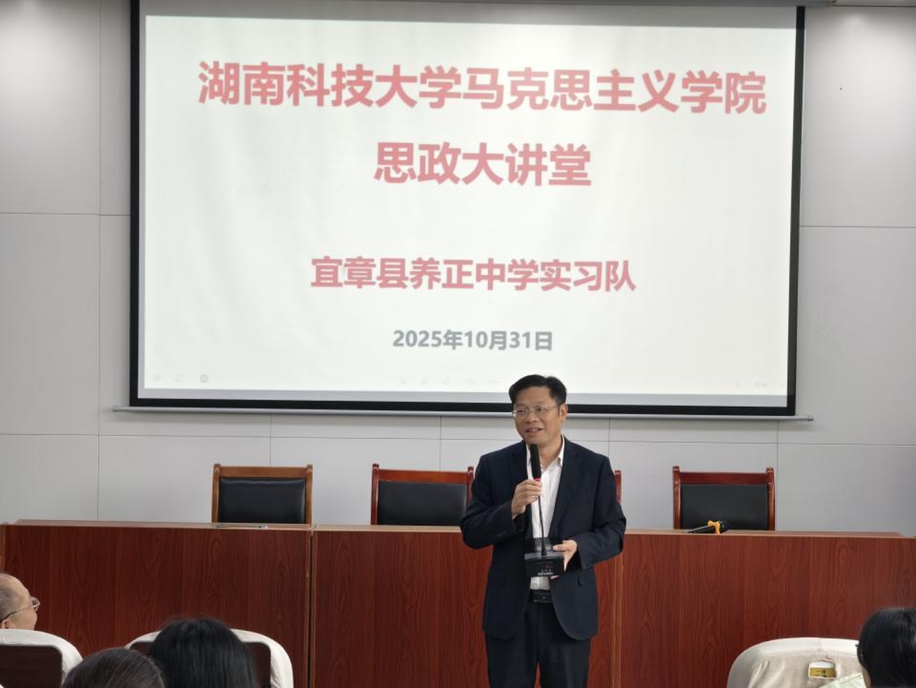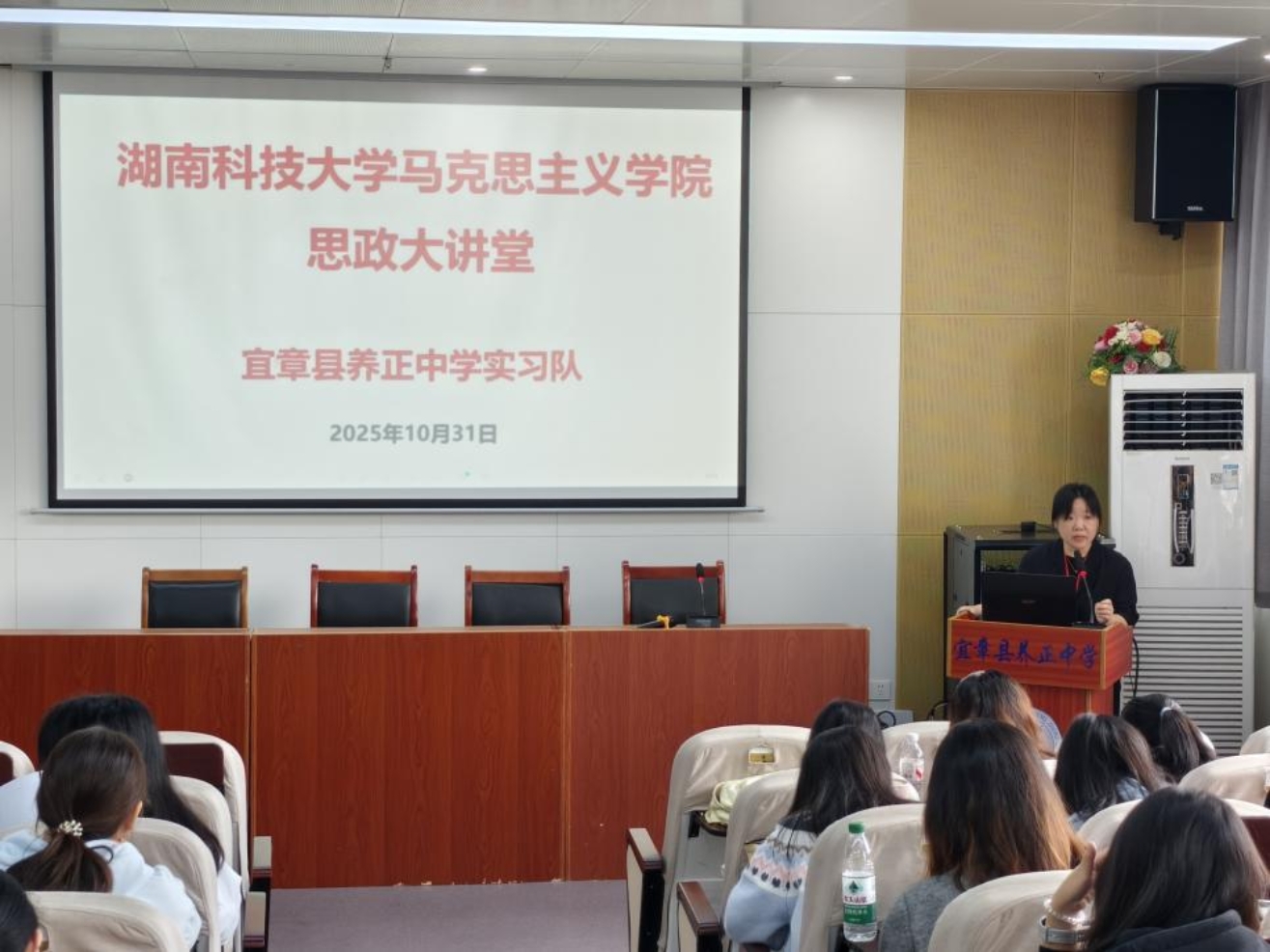 为助力我院思想政治教育专业实习生深化专业认知、锤炼教学技能,解决实习阶段面临的理论实践转化难题,明晰未来思政课教师的职业发展路径,2025年10月31日,湖南科技大学马克思主义学院举办了思政大讲堂“思政课教师专业成长”专题讲座。本次讲座特邀宜章县养正中学政治教研组骨干教师范雪姣、黄柳杏担任主讲嘉宾。宜章县养正中学校长胡耀平,我院2022级思想政治教育专业养正实习队带队教师罗建文教授、关洁博士,以及实习队全体成员共同参与了此次活动。