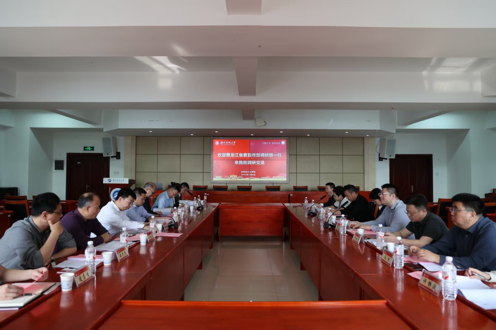 黑龙江省教育厅思政处(黑龙江省委教育工委宣传部)处(部)长张爽,哈尔滨工程大学马克思主义学院院长王景云,东北农业大学马克思主义学院院长许静波,黑龙江大学马克思主义学院院长王秋,黑龙江省委宣传部理论处一级主任科员马春涛;湖南省委宣传部理论处副处长黄晓明、二级调研员李晓勇;湖南科技大学宣传统战部常务副部长李洪华、副部长韩平,以及我院全体领导班子成员参加座谈。