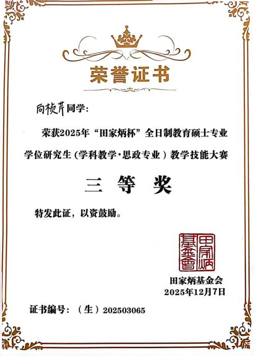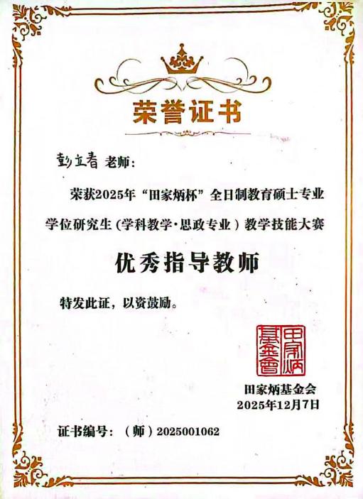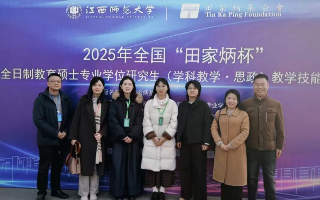 12月5日至7日,2025年全国“田家炳杯”全日制教育硕士专业学位研究生(学科教学·思政)教学技能大赛在江西师范大学圆满落幕。经过激烈角逐,我校马克思主义学院2023级学科教学(思政)专业硕士研究生刘超群荣获“二等奖”,向桢芹、王迁荣获“三等奖”;彭立春老师荣获“优秀指导教师奖”。